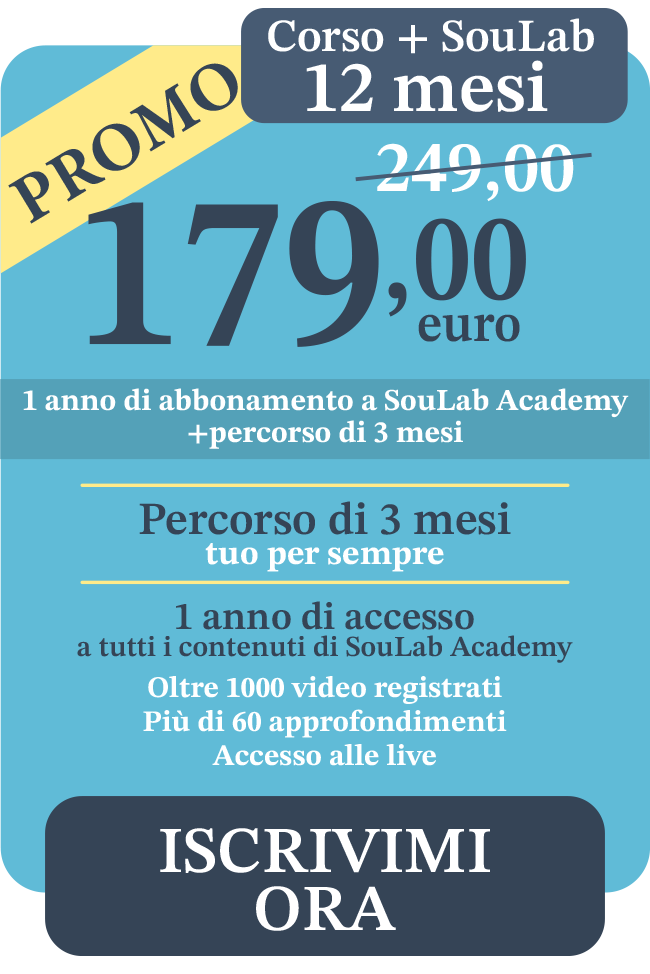 1) abbonandoti a SouLab Academy (solo con abbonamento annuale): in questo caso avrai accesso a tutti i contenuti di SouLab per un anno e, in più, al percorso guidato di 3 mesi “Non è solo sfortuna”.
